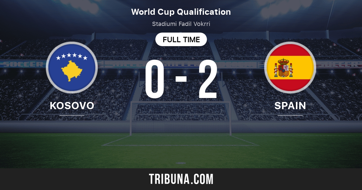 Kosovo vs Spain Prediction FIFA World Cup qualification UEFA 20210909 024500 Kosovo vs Not started Spain Last 5 Match. Kosovo vs Spain Date. Total score is 6 goals with 3 goals missed.